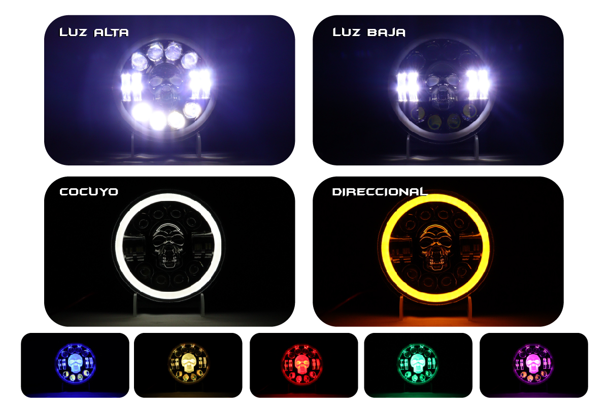 Modos de luz: haz alto, haz bajo, DRL blanco, DRL amarillo, Skull RGB+Flash, DRL blanco